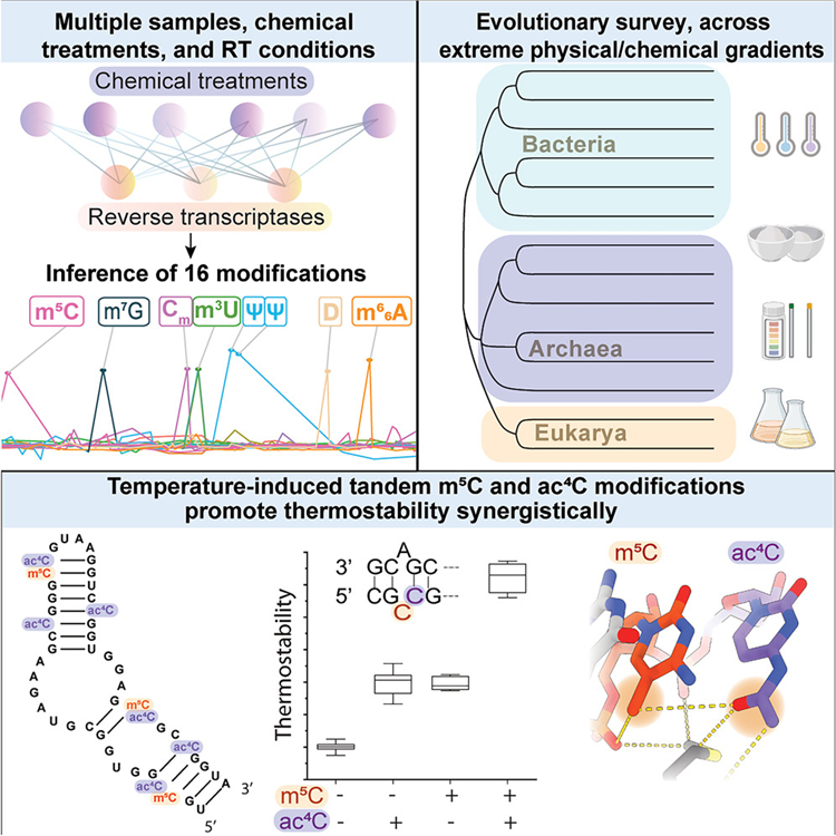 Pan-Mod-seq enables high-throughput profiling of 16 rRNA modifications across diverse species, revealing that while these chemical markers are largely static in mesophiles, they are highly dynamic in hyperthermophiles. Specifically, a conserved m5C-ac4C module is co-induced by heat and serves a critical role in stabilizing ribosome structure at extreme temperatures. Cryo-EM and biophysical analyses confirm that this modification module provides essential thermostability required for hyperthermophilic growth. ![]()